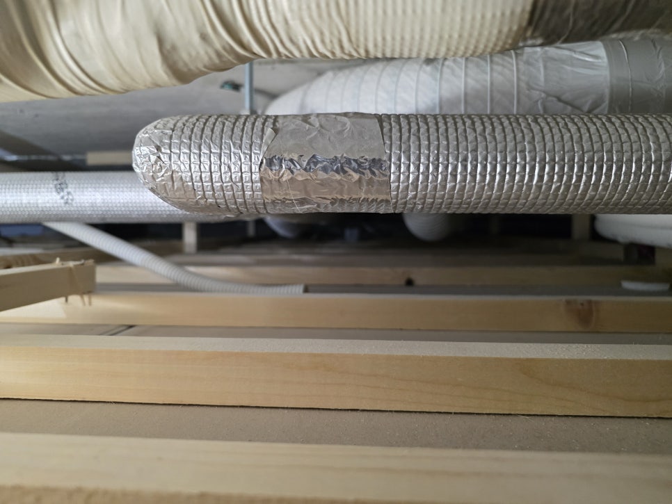 배관이나 기계 자체에 구멍이 나서 새는 것이 아니라, 배관 겉면에서 땀을 뻘뻘 흘리듯 엄청난 양의 물방울이 맺혀 떨어지는 경우도 있습니다. 배관 내부에는 얼음장처럼 차가운 물이 흐르기 때문에, 장마철 덥고 습한 천장 속 공기와 만나면 표면에 이슬(결로)이 맺힙니다. 이를 막기 위해 두꺼운 고무 발포 보온재로 배관을 꽁꽁 감싸야 하는데, 시공 불량으로 테이핑 틈새가 벌어졌거나 세월이 흘러 보온재가 삭아버린 경우 그 틈으로 결로가 비 오듯 쏟아집니다. 이는 기계 결함이 아닌 시공 불량 문제로, 반드시 전문가의 정밀 진단이 필요합니다.