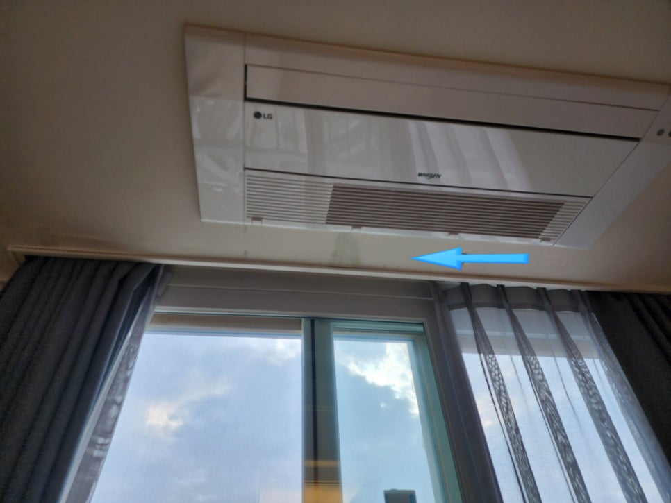기계 틈새로 맺히는 미세한 물방울 (초기 누수): 바람이 나오는 송풍구(루버) 날개 주변이나 기계 모서리 쪽 벽지가 아주 미세하게 젖어 들어가거나, 한두 방울씩 물이 맺혀 떨어진다면 배수가 원활하지 않아 기계 내부의 수위가 찰랑찰랑 넘치기 직전의 한계치에 다다랐다는 뜻입니다.