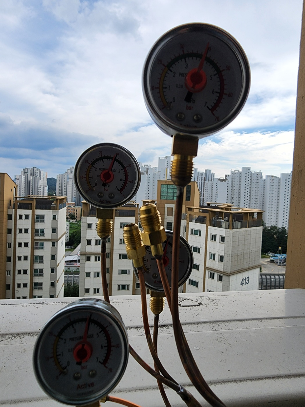 압력 게이지 설치: 질소봉입 후 압력게이지를 달아놓고, 설치 전까지 게이지 바늘의 변화를 확인합니다 .