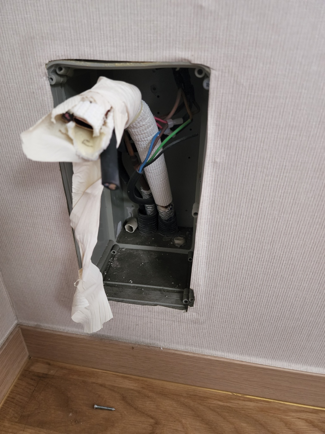매립배관에 설치된 기구(분배기)를 제거한 후 마감을 잘못하면 누설이 발생할 수 있습니다. 특히 고압관과 저압관의 보온재 마감이 제대로 되지 않으면 온도차로 인해 결로가 생기고 전선에 누전 위험이 발생할 수도 있습니다 .