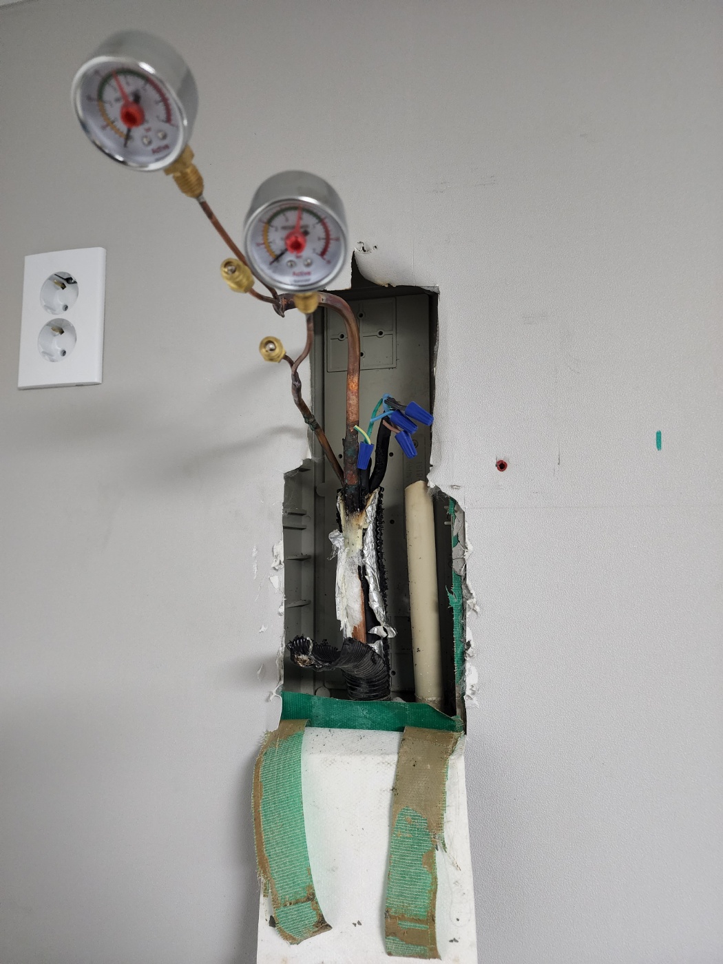 검사 결과: 질소 가스 압력 테스트 결과 10분 만에 압력이 0으로 떨어짐. 청음식 탐지기로 확인 결과, 벽 속 깊은 곳에서 누수음 발견.