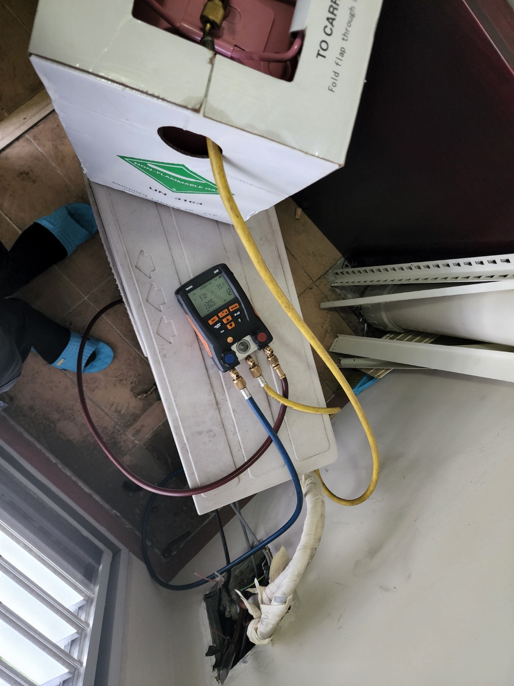 사후 처리: 수리를 진행하고 에어컨 매립 배관 전체 라인의 누설 여부를 체크하는 질소 기밀 작업을 필수적으로 진행했습니다 .