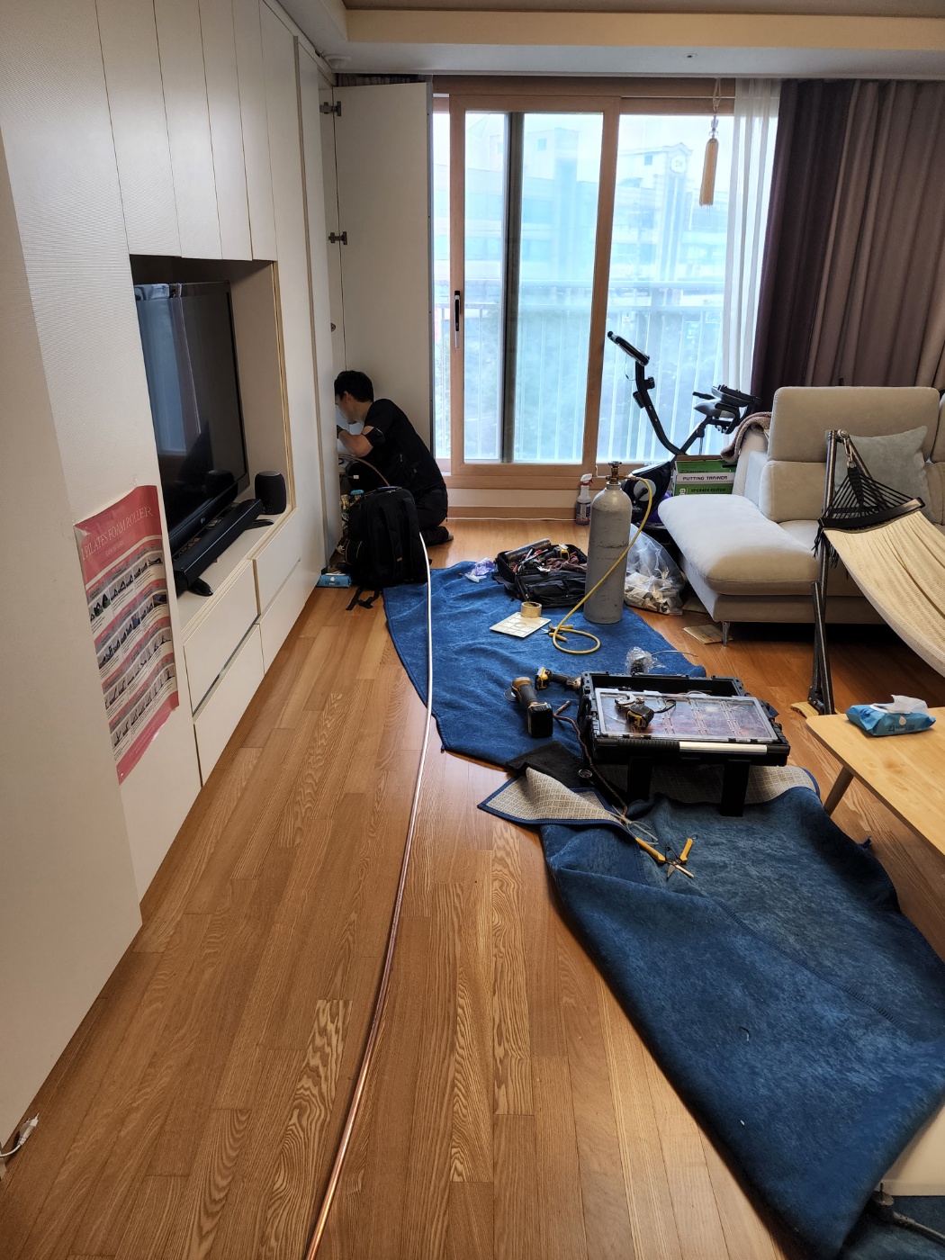 상황: 에어컨 설치를 다하고 테스트 가동 중 배관이 막힘 증상이 발생해서 현업에서 일하시는 설치기사님께서 수리를 의뢰한 현장입니다 .