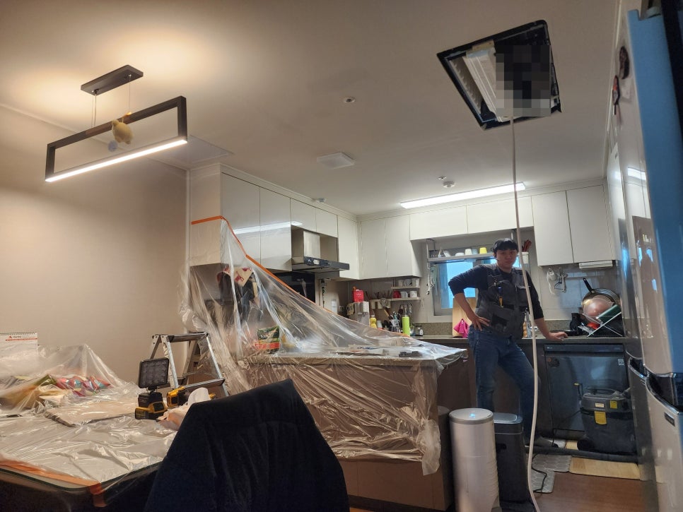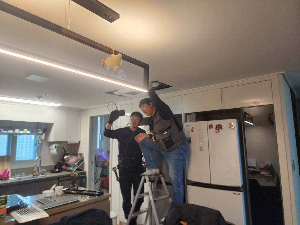 사다리를 이용해 천장 속 실내기에 접근합니다.