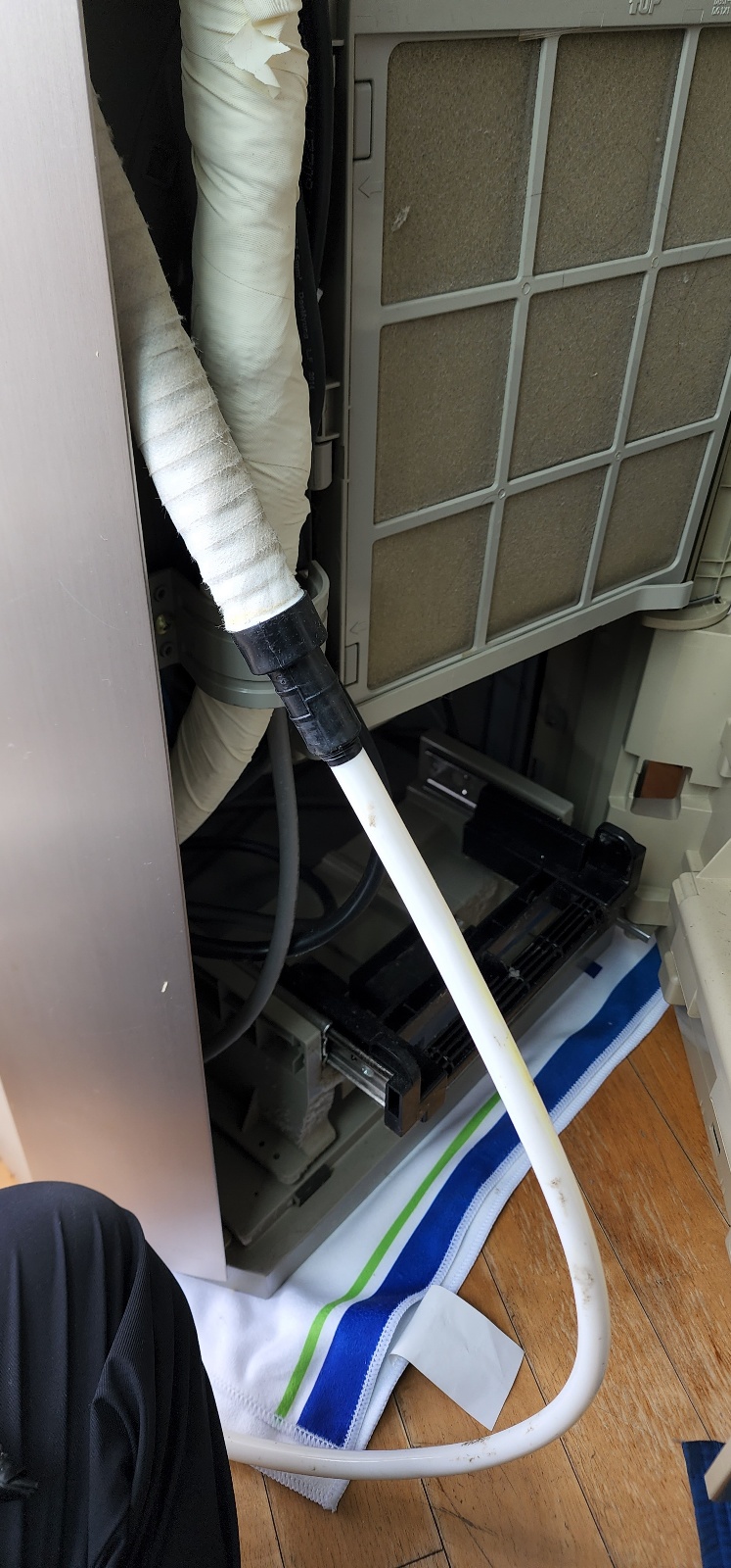 청소기 같이 생긴 고속 흡입기를 이용하여 에어컨 드레인 내부의 이물질을 제거하는 방법입니다. 가정 내 세대 드레인이 짧은 구간 막혔을 때 시도되는 방법입니다.