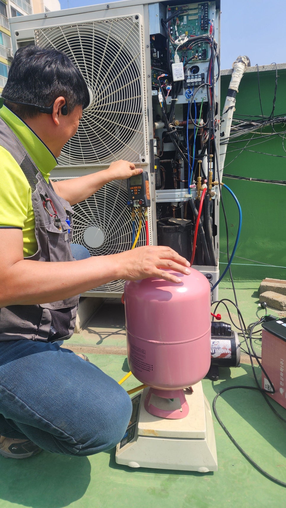 냉매 정량 충전: 저울로 제조사 사양에 맞는 정확한 양의 냉매 주입