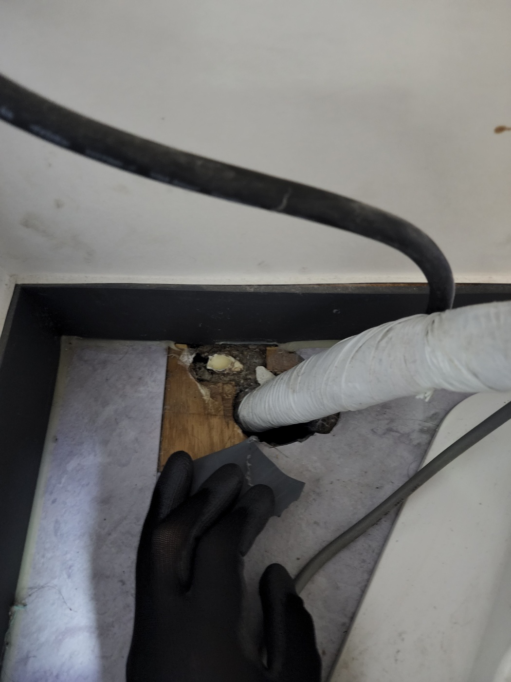 에어컨 가동 시 발생하는 습기가 먼지와 만나 끈적한 '젤리' 형태의 슬러지가 됩니다. 이 오염물이 배관을 꽉 막으면 물이 나가지 못하고 거꾸로 솟구쳐 오릅니다. 이것이 매립함 밖으로 넘쳐흐르는 것이 바로 누수의 시작입니다.