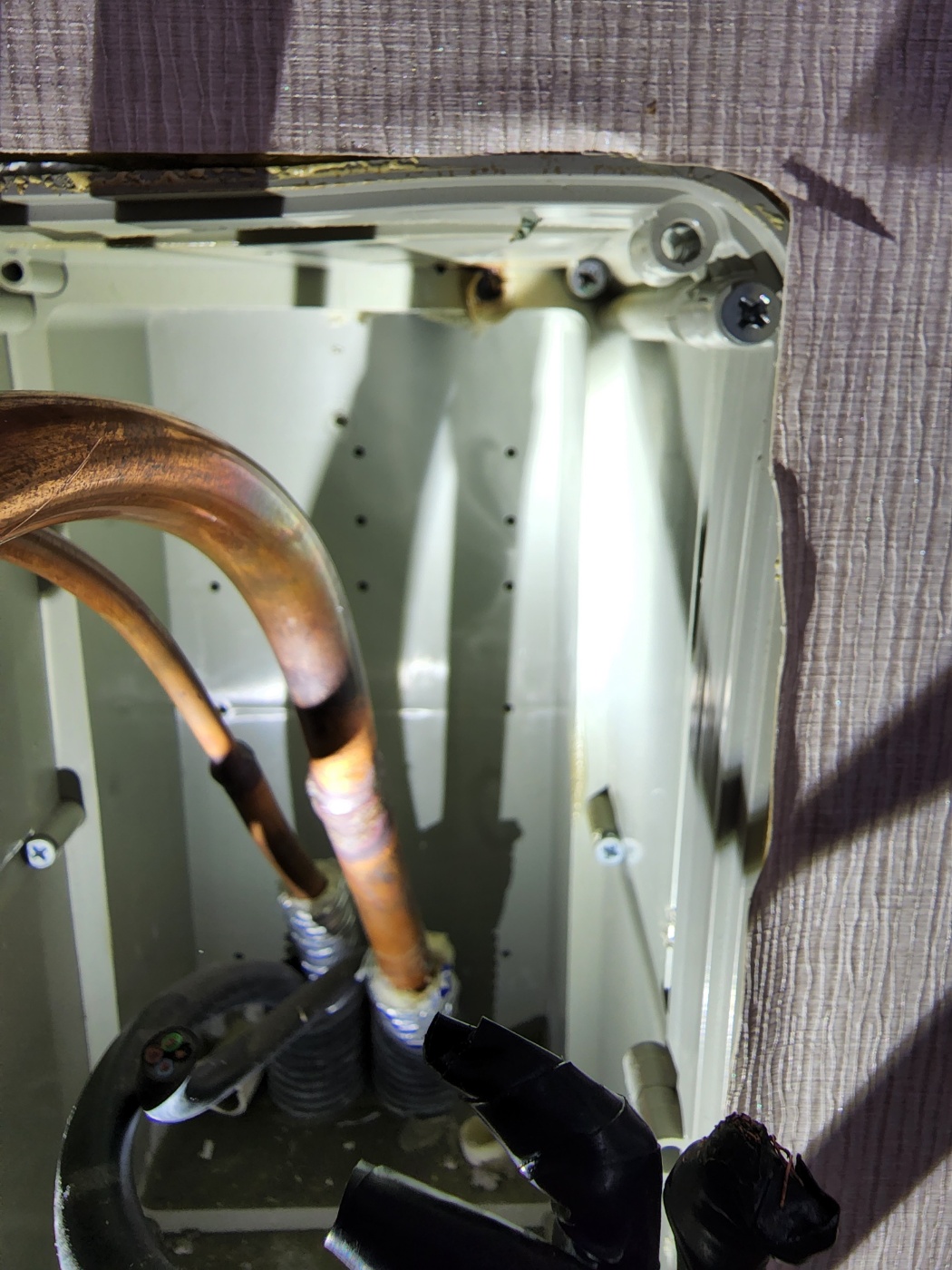 세입자가 바뀌면서 에어컨 철거와 설치가 이루어질 때마다 배관을 만지고 건드리면서 데미지가 작게라도 누적됩니다 . 그러면서 딱딱했던 배관 내구성이 약해지고 결국 리크(leak)가 발생됩니다 .